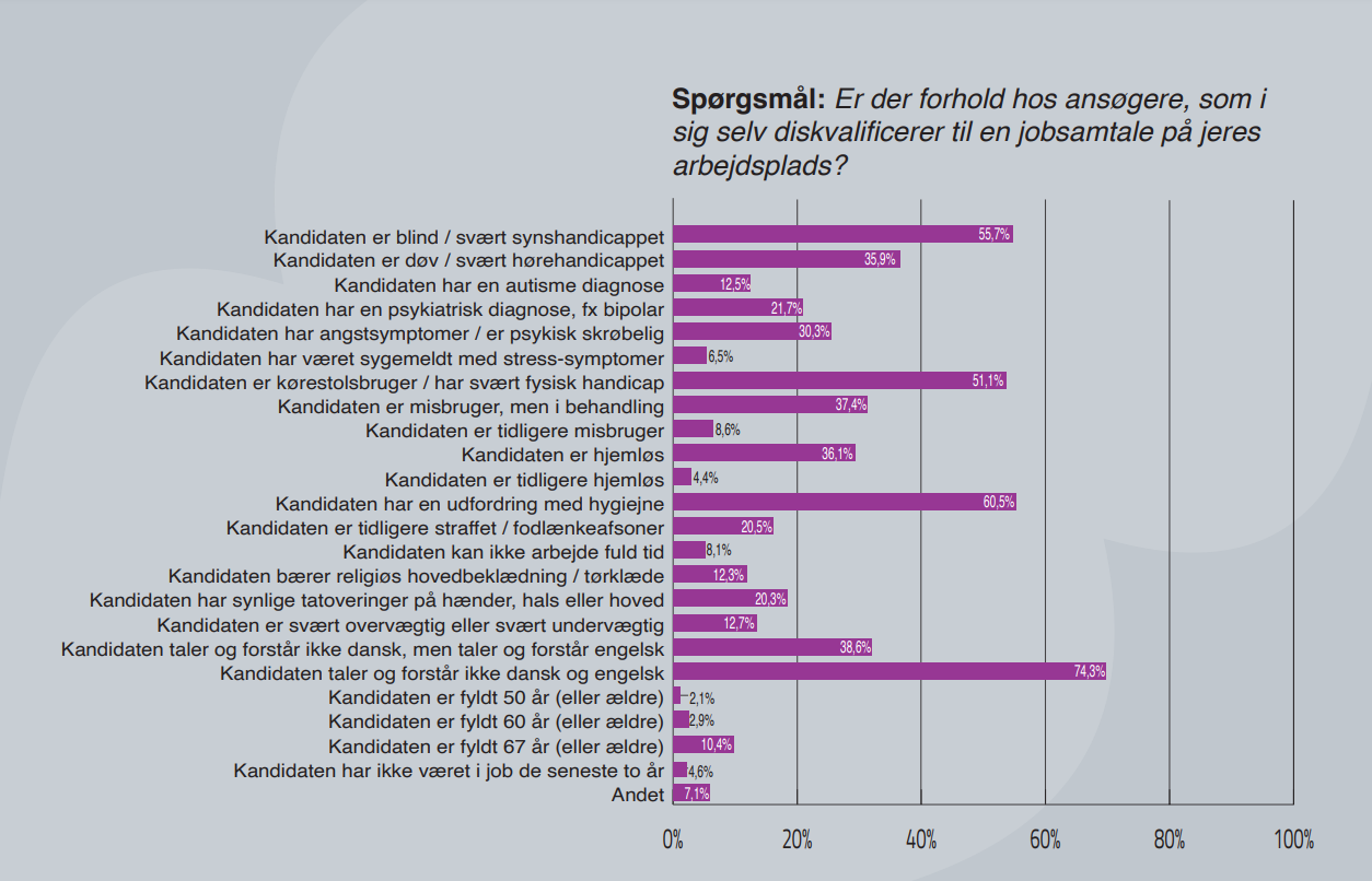 Det samme gælder for kandidater med en psykiatrisk diagnose som for eksempel bipolar, hvor 21,7 % af arbejdsgiverne i 2023 afviser denne gruppe i forhold til næsten 30 % sidste år. Den mest udfordrede målgruppe er stadig ”kandidater, der ikke taler og forstår dansk og engelsk,” hvor hele 74,3 % af arbejdsgiverne afviser uden en samtale. Dernæst følger ”kandidater, der har udfordringer med hygiejne,” hvor 60,5 % af arbejdsgiverne afviser.